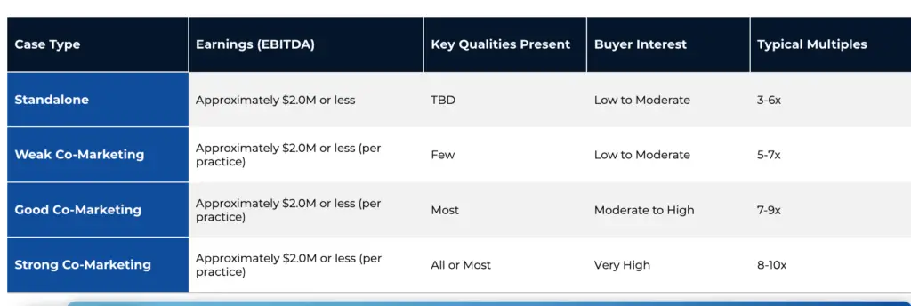 On average, properly co-marketed practices with ~$2.0M or less in EBITDA on an individual company basis, achieved valuation multiples that were 50–100% higher than comparable standalone deals.​