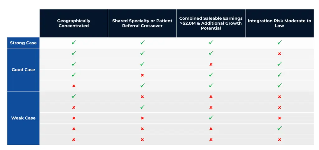 When two or more smaller practices go to market together, the impact can be significant. For example, two practices each generating $1.0M in earnings can combine to form a $2.0M earnings profile, often resulting in a 50–100% higher valuation compared to going it alone.​