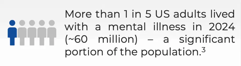 In 2024, approximately 60 million US adults (23.08% of all US adults) had a mental illness, and more than 122 million people live in a mental health workforce shortage area.2